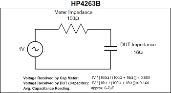 當從測試設備中將1.0 Vrms的電壓加到電容器時,電壓在儀表阻抗和電容器阻抗之間被分壓。對于HP4263B測試儀,其阻抗保持為100 Ω不變(圖1),而對于HP4278A測試儀,計算的電容器阻抗變為1.5 Ω(圖2)。結果表明,對于HP4263B測試儀,絕大多數外加電壓會降低在測試儀阻抗中,而HP4278A測試儀可以使電容器能夠接收大部分外加電壓。因此,HP4263B測試儀顯示的測量值將低于真實值。