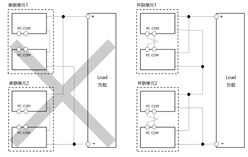相比之下,將已經并聯連接的TDK-Lambda電源單元進行串聯是可行的。因為并聯連接的電源單元電壓相同,將它們串聯起來不會引發上述問題。但即便如此,也需要注意以下幾點: